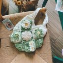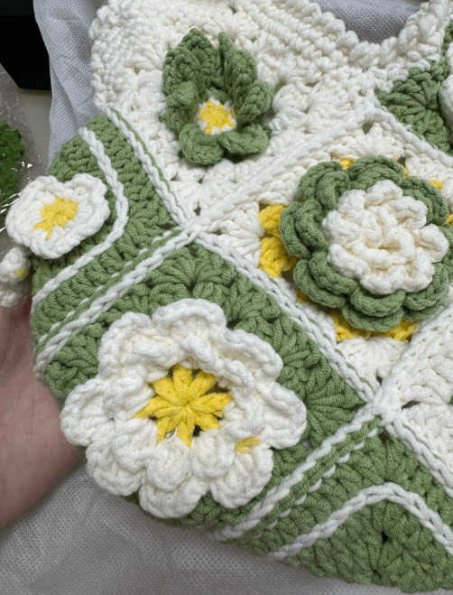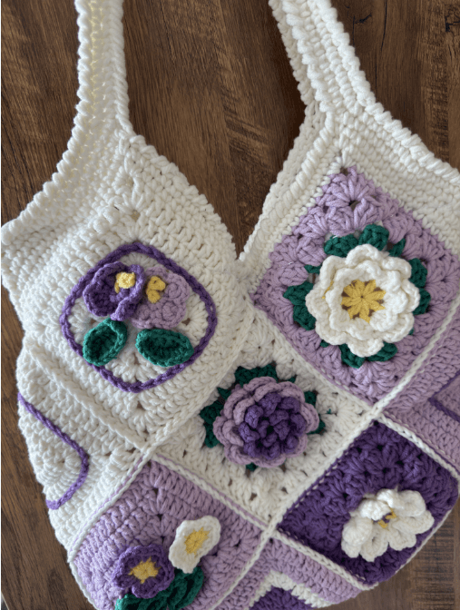 - This handcrafted crochet tote bag is a true work of art. With its intricate violet wisteria flower crocheting, this bag is both cute and elegant.